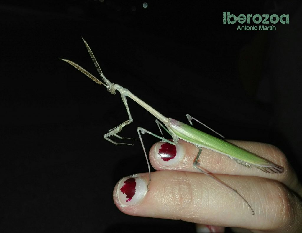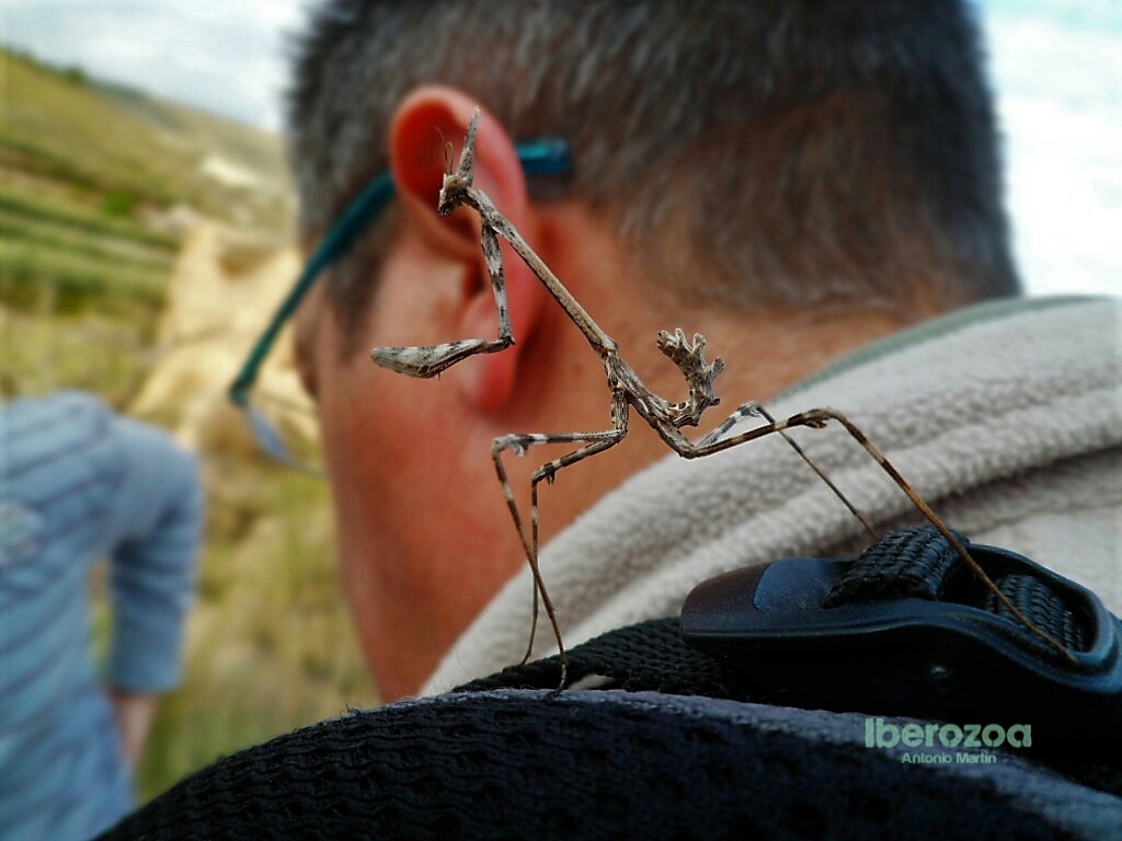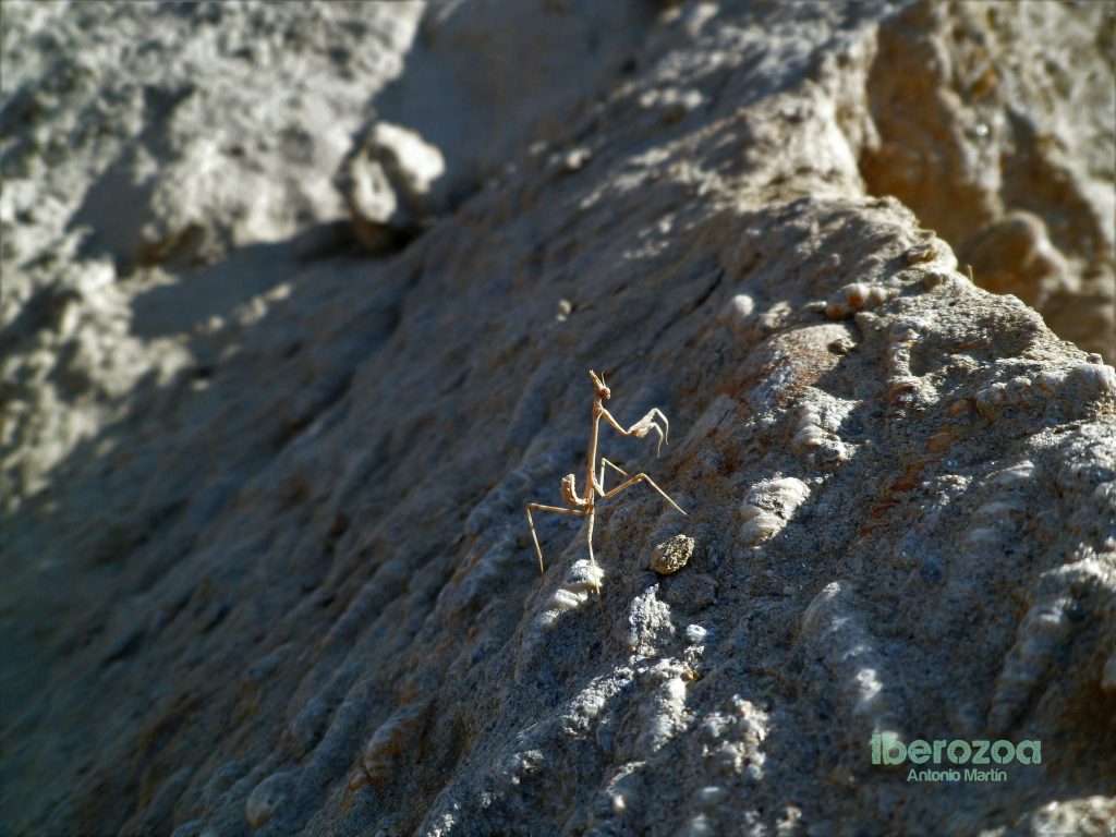Esta mantis palo hembra (Empusa pennata) se desplaza por un antiguo lecho marino del Mioceno, lleno de fósiles de Turritella (caracolas). Las mantis adquieren el color del entorno que les rodea al mudar. Su nombre le viene de las criaturas de la mitología griega del mismo nombre, Empusas, asociadas al infierno y capaces de cambiar su aspecto para seducir a los hombres y después devorarlos. Sin embargo, esta especie no es tan dada como otros mantoideos a realizar el típico ritual de comerse al macho tras la cópula.
