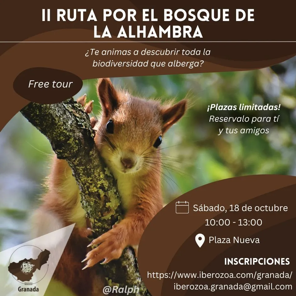 🌿Recorrido por el bosque que rodea la Alhambra con el objetivo de divulgar la biodiversidad que alberga. ¡Flora autóctona mediterránea, especies ornamentales, numerosas aves, anfibios y algún que otro mamífero! Un paseo natural en el mejor entorno cultural. Los monitores planeamos ceder algún prismático en nuestra posesión y crear diagramas ilustrativos para amenizar la explicación.