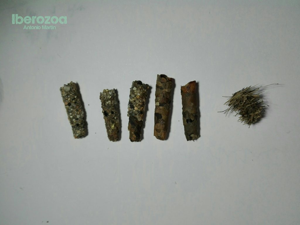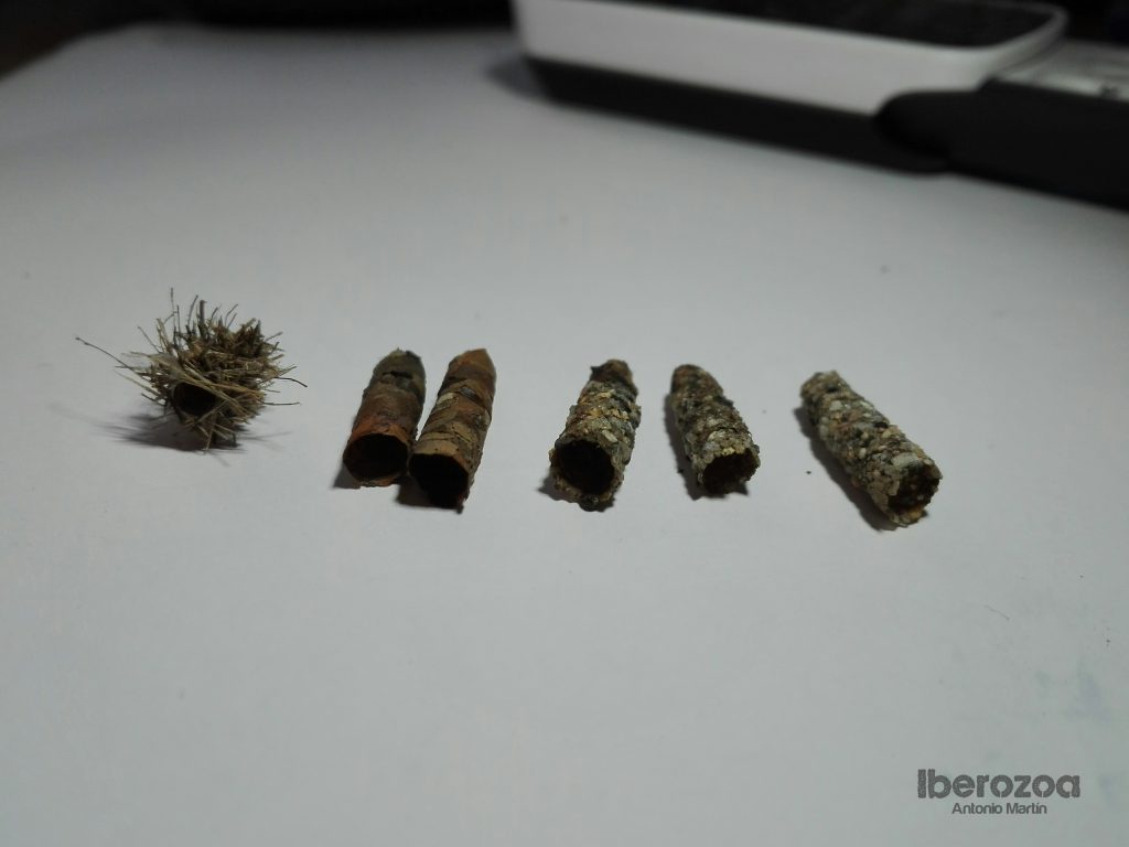 Una pequeña muestra de la gran variabilidad de estuches que pueden fabricar las larvas: con hojas, cortezas, hierbas, granos de arena… Cualquier material disponible en el entorno. Son una especie importante para los ecosistemas y también como bioindicadores: al igual que muchos otros macroinvertebrados acuáticos, su presencia en masas de agua sirve para calcular el IBMWP, un índice que mide la calidad del agua en un número en función de las especies de invertebrado que lo habitan, basándose en que no todas las especies tienen la misma tolerancia a la contaminación y asignándoles un número a cada una. A mayor número, menor es su tolerancia a la contaminación y por tanto mayor es la calidad del agua. Pero esto lo veremos en otra publicación.
