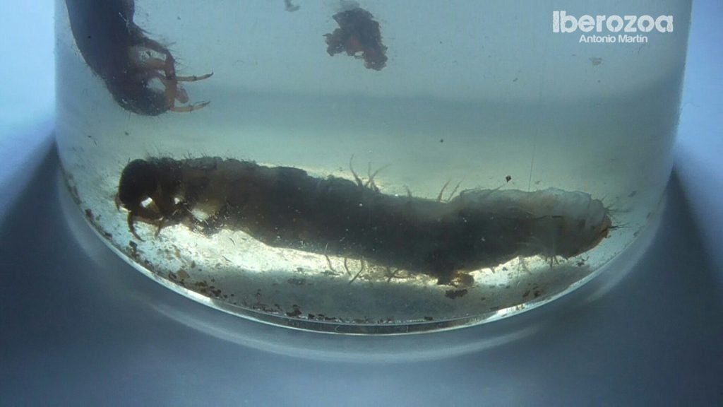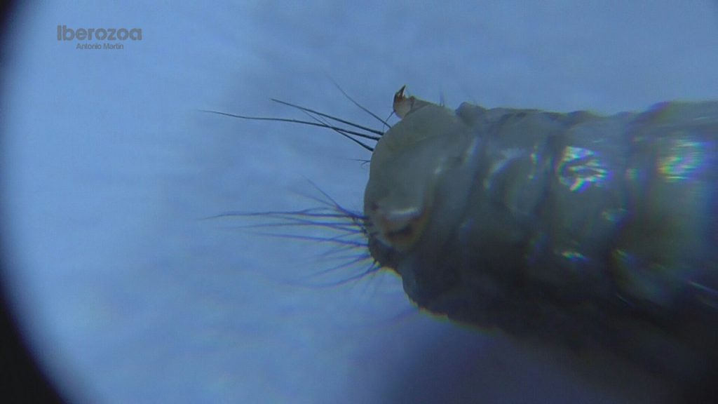 Las larvas de tricóptero construyen un característico estuche con los materiales de su entorno, viviendo protegidas en arroyos, ríos y masas de agua. Se mantienen dentro gracias a unos apéndices ganchudos posteriores llamados pigópodos (segunda foto) y pueden respirar gracias a las branquias filamentosas que emergen de su cuerpo (primera imagen).