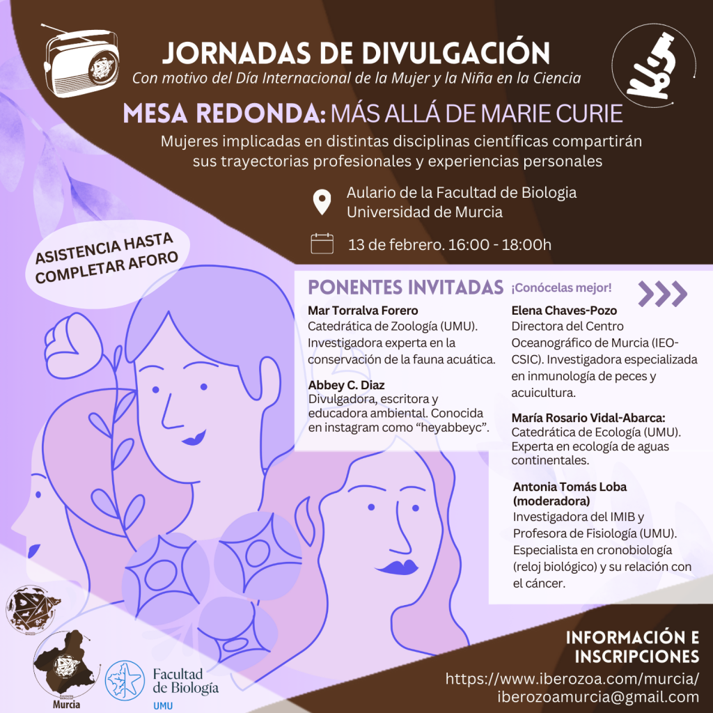 Contaremos con una mesa de lujo con figuras de la talla de Mar Torraval Forero, catedrática de Zoología; María Rosario Vidal-Abarca, catedrática de Ecología experta en aguas continentales; Elena Chaves-Pozo, directora del Centro Oceanográfico de Murcia; Abbey C. Díaz, divulgadora y educadora ambiental; por último tenemos como invitada y moderadora a Antonia Tomás Loba, experta en cronobiología.