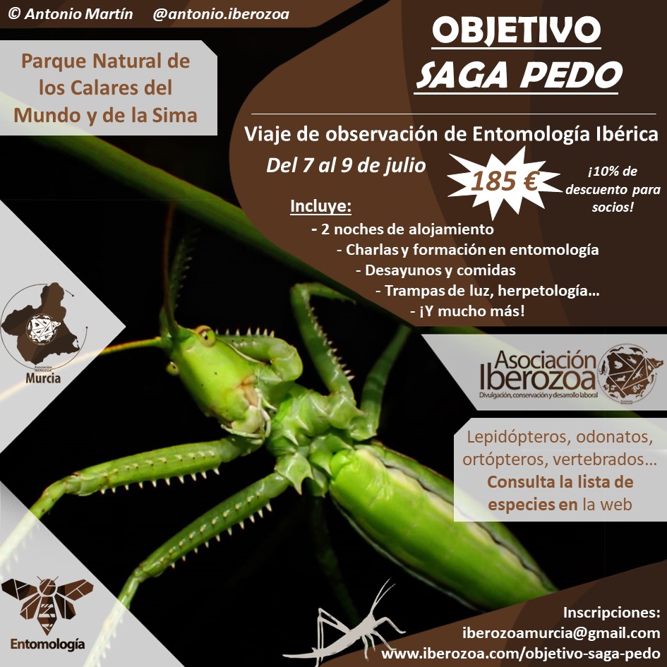 Tras varios años prospectando la Sierra de Alcaraz, lanzamos estas jornadas entomológicas en las que visitaremos el Parque Natural de los Calares del Mundo y de la Sima, una de las zonas con mayor biodiversidad de insectos de la Península, descubriendo especies tan enigmáticas como el Saga pedo y numerosos endemismos ibéricos de vertebrados e invertebrados. Conoceremos más sobre técnicas de estudio en entomología e indagaremos en algunos de lo grupos de artrópodos más peculiares. Formarás parte de la primera de muchas expediciones en busca de los insectos más impresionantes de nuestra entomofauna, acompañado por 5 monitores de las secciones de Iberozoa Murcia, Entomología y Herpetología.